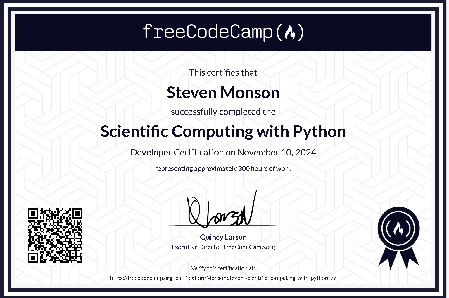 The Scientific Computing with Python curriculum will equip you with the skills to analyze and manipulate data using Python, a powerful and versatile programming language. You’ll learn key concepts like data structures, algorithm, Object Oriented Programming, and how to perform complex calculations using a variety of tools.