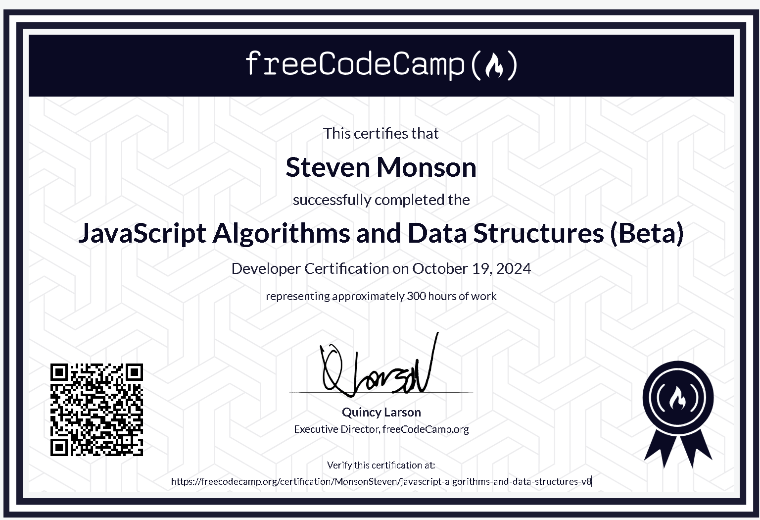 In this JavaScript Algorithm and Data Structures Certification, you’ll learn the JavaScript fundamentals like variables, arrays, objects, loops, functions, the DOM and more.